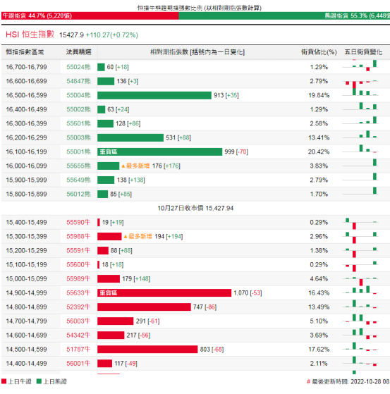 街货分布,至周四,恒指牛证街货主要在收回价14500点至15100点之间,累计相当约3128张期指合约;恒指熊证街货在收回价16100点至16600点之间,累计相当约2634张期指合约。