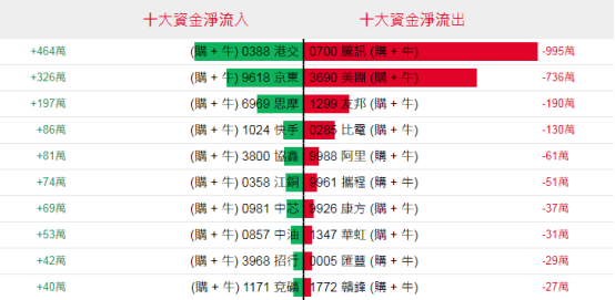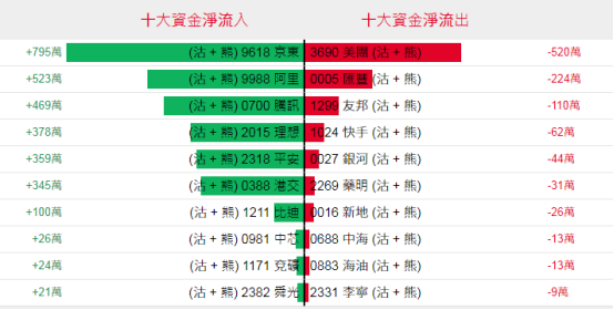淡仓(认沽证及熊证)方面,周四京东集团、阿里巴巴、腾讯控股、理想汽车、中国平安等相关淡仓分别约795万、523万、469万、378万及359万港元资金净流入部署;美团、汇丰、友邦相关淡仓则分别约520万、224万及110万港元资金净流出。
