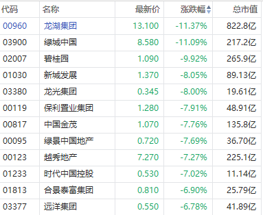 10月28日讯,港股内房股走弱,截至发稿,碧桂园跌超9%,龙湖集团、绿城中国跌超11%、新城发展、龙光集团跌超8%。