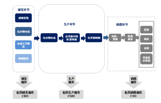 按照所处环节可以下分为研发阶段的CRO(Contract Research Organization, 合同研发组织)、生产阶段的CMO(Contract Manufacture Organization,合同加工组织)和CDMO(Contract Development and Manufacturing Organization,合同开发加工组织)以及最后销售阶段的CSO(Contract Sales Organization,医药合同销售组织)。