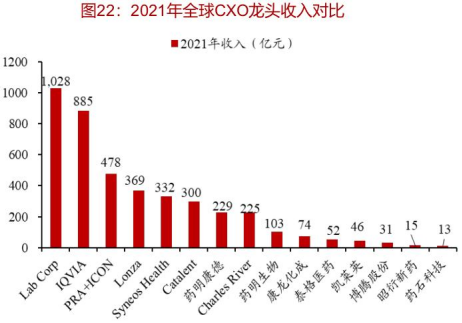 再把视线投向海外。美国CXO巨头Laboratory Corp在2021年营收高达1028亿元人民币,位列世界第一,世界前六的CXO企业营收合计更是接近3400亿元人民币。