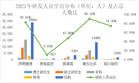 在体现企业科研水平的高水平人员人数上,药明康德更是远远领先,研究生学历人数过万,博士1173名。