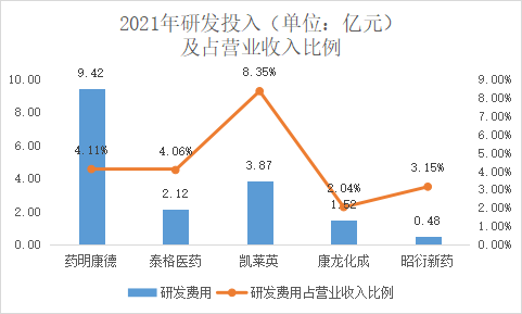 同样的,在研发支出上,尽管比例不是很高,但绝对值远超其他各家之和。并且在药明康德披露的信息中,2020、2021两年的研发费用同比增长率分别为17%和36%,今年截止至年中已经支出6.57亿元,同比增长率更是高达63%,可以推测药明康德今年在研发上的投入很可能突破10个亿。