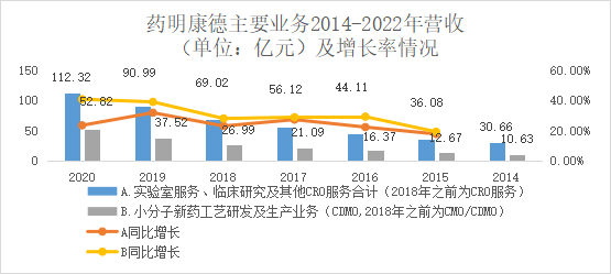 作为以CRO起家的企业,CRO业务自然也一直是药明康德营收大头。2014年至2020年,药明康德实验室服务、临床研究及其他CRO服务(2018年之前为CRO服务)以同比20%-30%的增速稳定增长,贡献了每年总营收的七成左右。