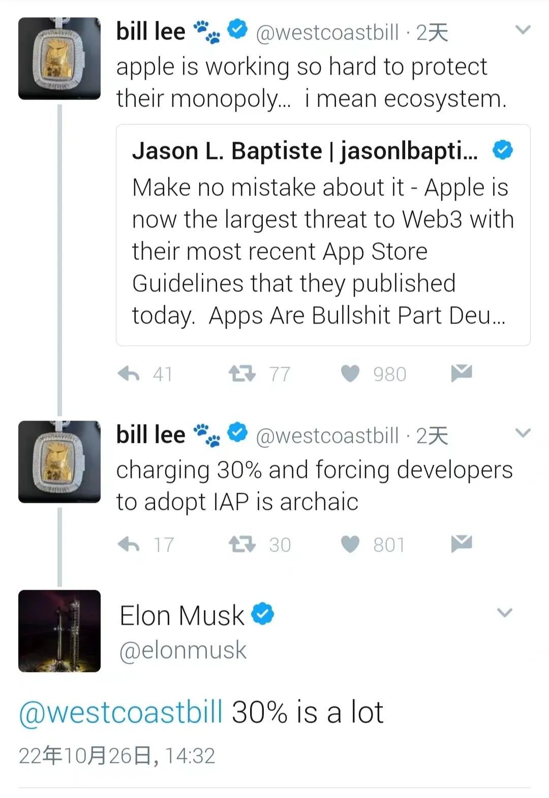 一个月内苹果三次拒绝Spotify有声读物应用上线的事情,一度引来特斯拉CEO马斯克的关注,并在Twitter上回复埃克称,这的确“令人担忧”,并再次抨击了苹果税的做法,在“对社交媒体广告抽成30%”的帖子下方回复称“30%确实太高”。