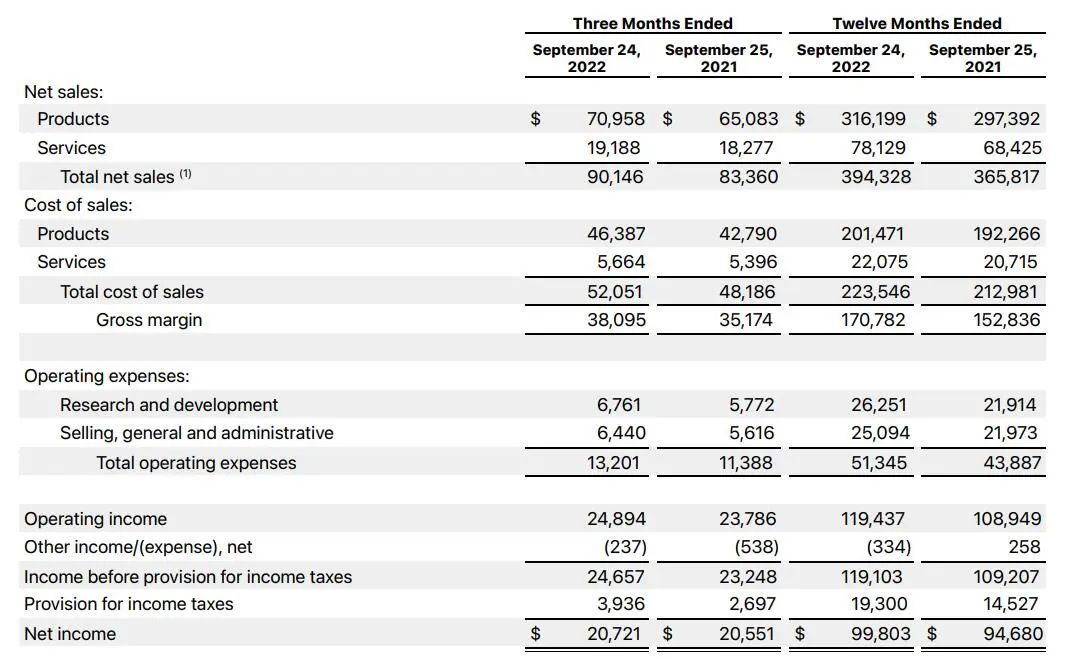 北京时间10月28日凌晨,苹果公司发布2022财年第四财季(即2022年度第三季度)财报。当季财报显示,苹果第三季度总营收901.5亿美元,同比增长8%;净利润207.2亿美元,同比微增1%。