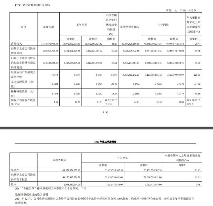 中国中免公告,第三季度营收117.14亿元(人民币,下同),同比减少16.17%;第三季度净利润6.9亿元,同比下降77.96%;首三季营收393.64亿元,同比下滑20.47%;首三季净利润46.28亿元,同比下滑45.48%。