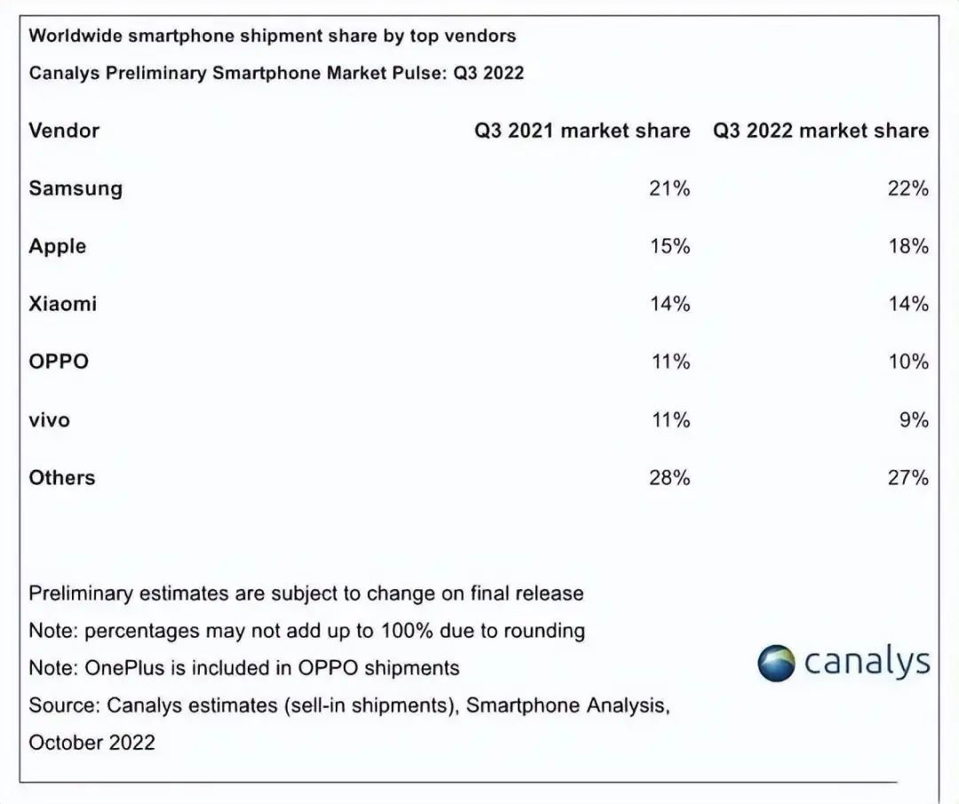 苹果显然顶住了压力,全球市场份额从去年同期的 15% 提升到 18%,是前五大手机厂商中增速最快的。在中国市场,除了苹果出货量同比增长 36%,小米、OPPO、vivo 和荣耀都经历了双位数下滑,OPPO 下滑最为严重,达 27%。