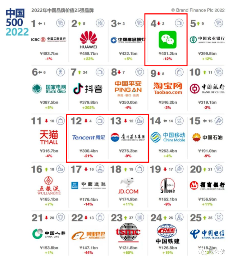 全球领先的品牌价值评估机构Brand Finance近期发布了《2022中国品牌价值500强》榜单。腾讯和茅台分别位列第12和13位。腾讯旗下微信位列第4。两者分居互联网行业和食品饮料行业榜首,同时腾讯和茅台品牌评级继续保持AAA级(最高级)