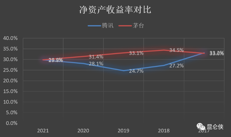 以2021年的净利润进行换算,茅台日赚1.4亿元,腾讯日赚超过3亿元。并且二者的盈利质量非常高,应收账款很少,也不需要庞大的资本开支。当然,由于腾讯和茅台的净资产不一样,所以不能单独看盈利的绝对额,通过对比两者近5年来的净资产收益率,我们发现两者为股东赚取利润的能力都很强,ROE远高于15%的优秀等级。