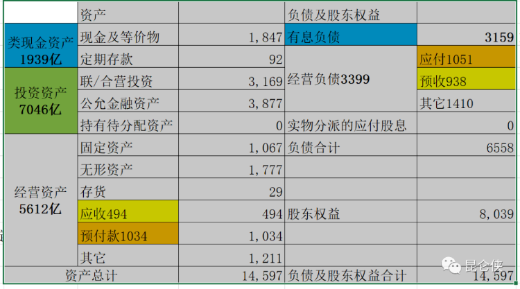 可以看到腾讯投资资产7046亿,类现金资产1939亿,对应3159亿的有息负债,多出1200亿净负债。而经营资产5612亿,经营负债3399亿,预付和应付基本相等都是1000亿出头,预收938亿大于应收款494亿。