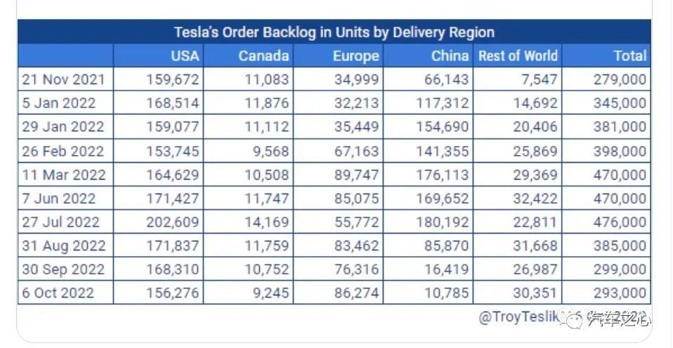 值得一提的是,特斯拉在中国地区的积压订单下降速度非常快,此前最高 7 月份超过 18 万辆的订单,到 10 月已经降至 1 万辆左右。