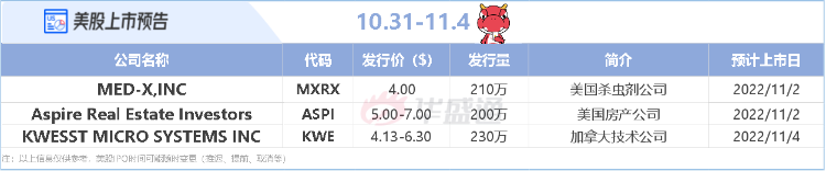 本周IPO市场,截至目前,暂时预计将迎来3只新股挂牌,美国杀虫剂公司MED-X和美国房产公司ASPI预计周三挂牌。需要注意的是,美股IPO时间可能随时变更(包括提前、延后等),投资者需持续跟进相关消息。