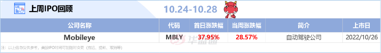 上周美股市场只有1只新股上市,英特尔旗下自动驾驶公司MBLY上周三以21美元的发行价登陆美股市场,首挂涨幅近38%,收盘价报28.97美元,市值超230亿美元,同时创下了美国大型IPO年度最佳首日表现。