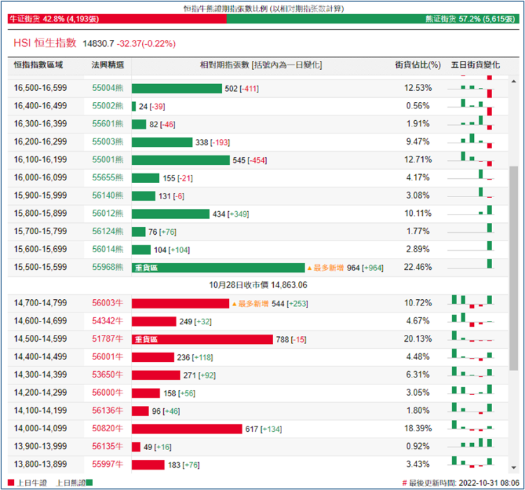 街货分布方面,至上周五,恒指牛证街货重货区间主要在收回价14300点至14800点之间,累计相当约2088张期指合约;恒指熊证街货重货区主要在收回价15500点至16000点,累计相当约1709张期指合约。