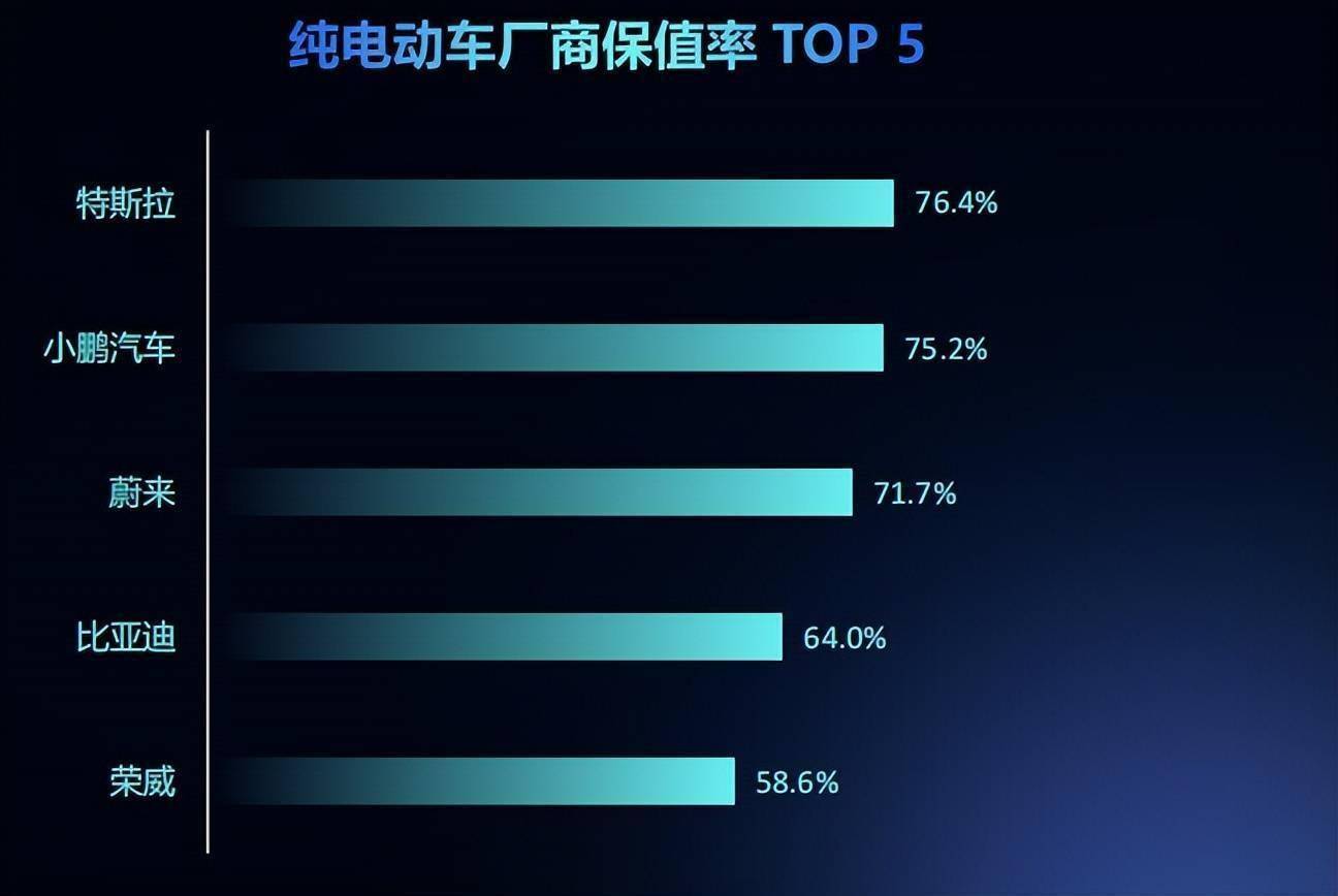 今年纯电动车的保值率首度被纳入研究范畴。值得注意的是,不同于燃油车统计的是三年保值率,纯电动车统计的是一年保值率。以一年保值率为标准,第一位是特斯拉,其他四位分位是小鹏汽车、蔚来、比亚迪、荣威。
