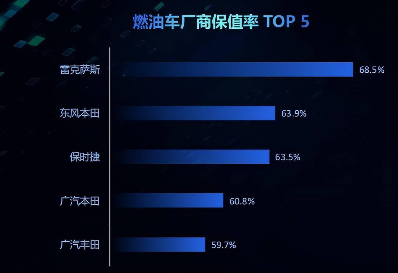 从该报告的数据来看,燃油车方面,日系车继续领跑榜单,并且在保值率前五的厂商中,日系品牌占了四席。燃油车统计的是三年保值率。保值率第一的雷克萨斯,其三年保值率达到了68.5%。其次是东风本田、保时捷、广汽本田和广汽丰田。