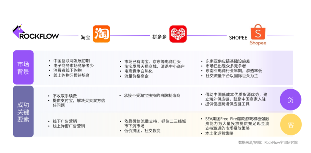 复盘淘宝、拼多多和Shopee的成功路径,三者都在当时的市场环境下,利用一切资源同时解决了海量商品供应和消费者两大问题,成功将海量卖家和买家吸引到平台上,成为了特地市场和区域的最大网上商城,迸发出无限价值。
