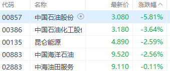 截止发稿时,中国石油股份(00857.HK)股价跌近6%,中国石油化工股份(00386.HK)跌超3%,中海油(00883.HK)跌超2%。