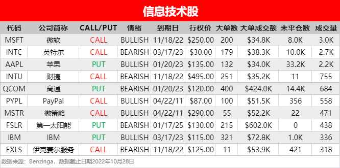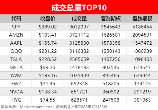 美东时间上周五(10月28日),美股全线收涨,道指收涨2.59%,标普500指数涨2.46%,纳指涨2.87%。期权市场方面,交易活跃度大增,期权成交总量为47,442,174张,前值39,094,088张,远高于90日平均成交量37,200,503。其中,看跌期权合约占比47%,看涨期权合约占比53%。