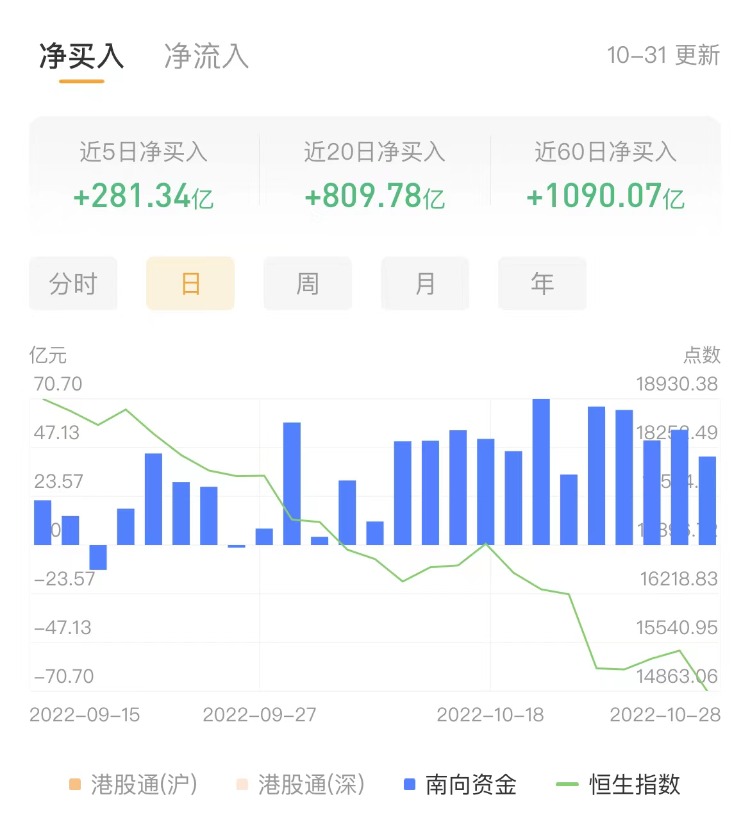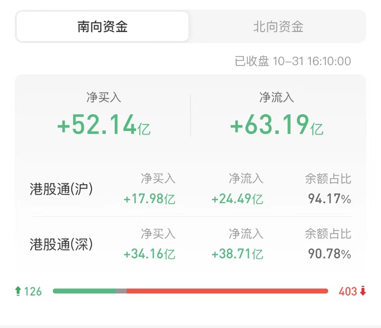 南下资金今日净买入港股52.14亿港元,其中港股通(沪)净买入17.98亿港元,港股通(深)净买入34.16亿港元。上一交易日净买入港股42.8亿港元。