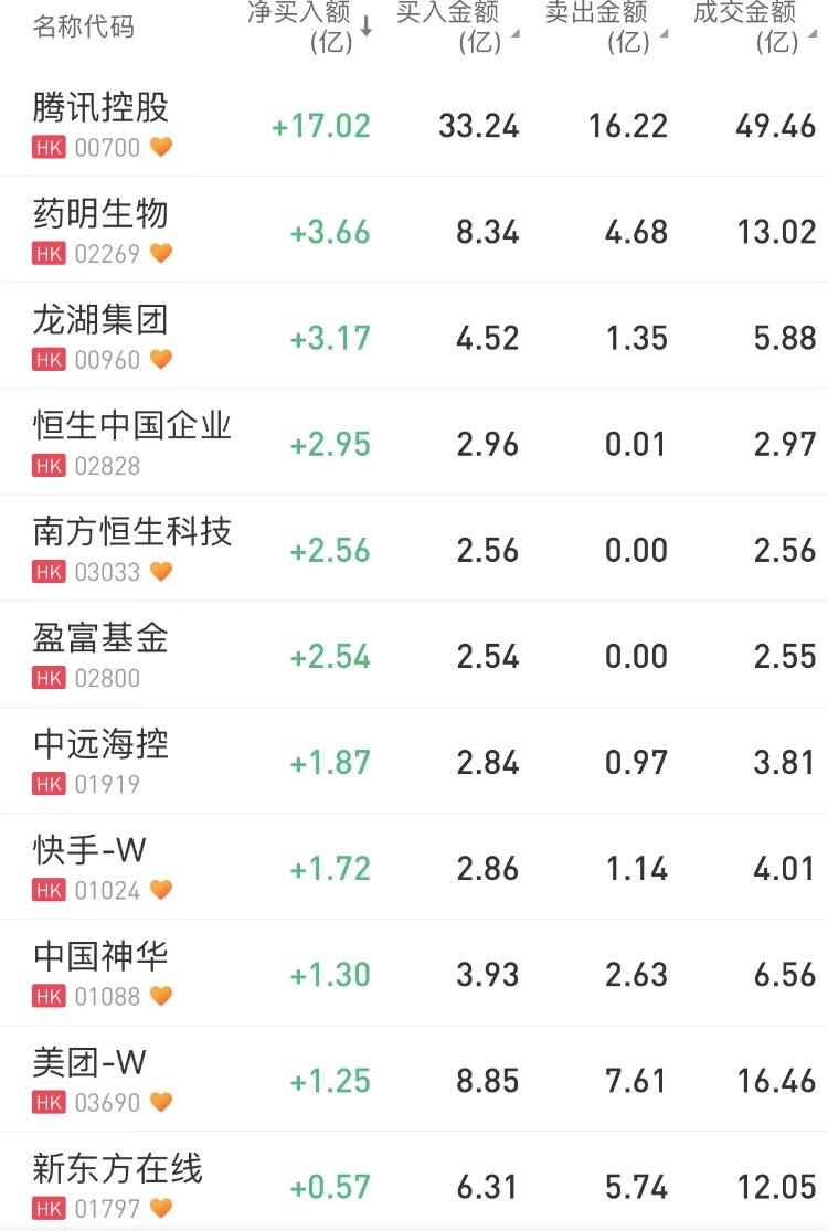 南下资金净买入腾讯控股 $00700.HK 17.02亿港元,净买入药明生物 $02269.HK 3.66亿港元。此外,龙湖集团 $00960.HK 获净买入3.17亿港元,恒生中国企业 $02828.HK 获净买入2.95亿港元。