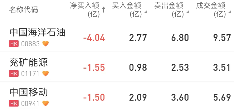 南下资金净卖出中国海洋石油 $00883.HK 4.04亿港元,为今日卖出之最。净卖出兖矿能源 $01171.HK 1.55亿港元,净卖出中国移动 $00941.HK 1.5亿港元。