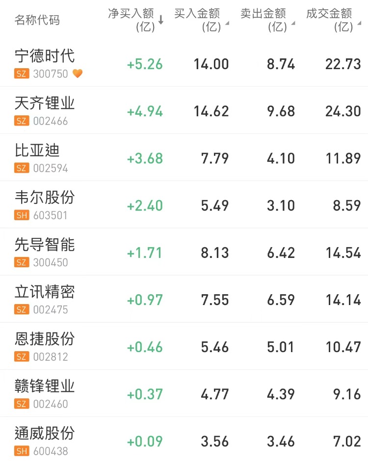北上资金今日净买入宁德时代 $300750.SZ 5.26亿元,为今日买入之最;净买入天齐锂业 $002466.SZ 4.94亿元。