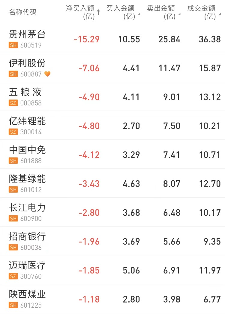 今日北上资金净卖出贵州茅台 $600519.SH 15.29亿元,伊利股份 $600887.SH 遭净卖出7.06亿元。