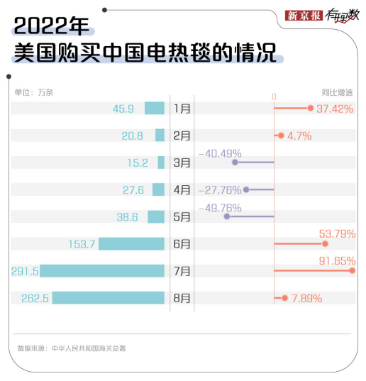 虽然今年3-5月份,同比增长为负,但是进入6月份便开始加速采购中国的电热毯。7月,同比增速同样超过了90%。而且,今年美国前八个月进口中国电热毯的数量是整个欧洲的两倍还多。