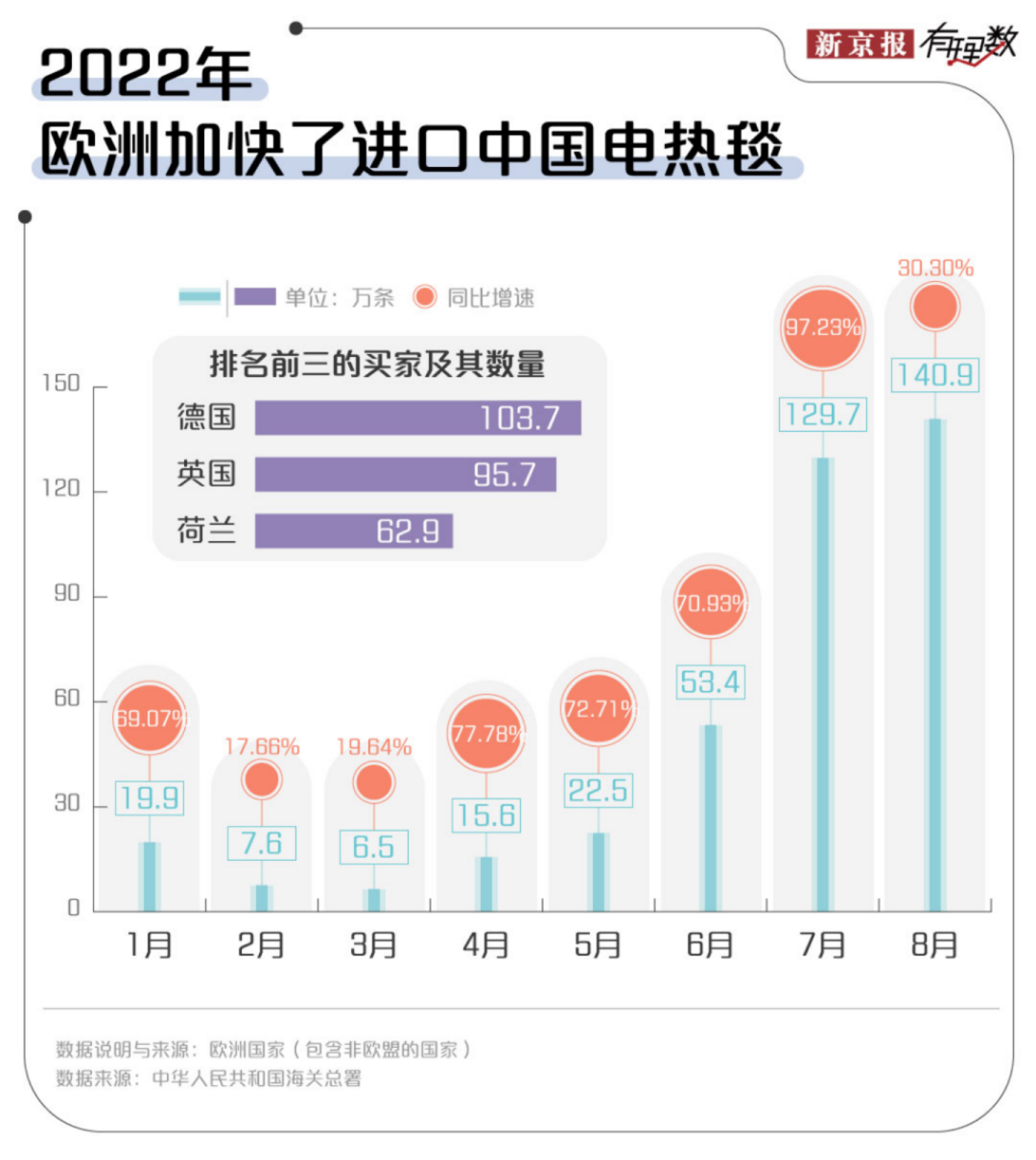不过说起电热毯,可不是只有彩虹集团。海关总署的数据显示,7月份欧洲国家从中国进口电热毯129.7万条,同比增长97.23%。有意思的是,第二季度,每个月的同比增速都超过了70%。截至8月底,德国、英国与荷兰成为了欧洲的三大买家。