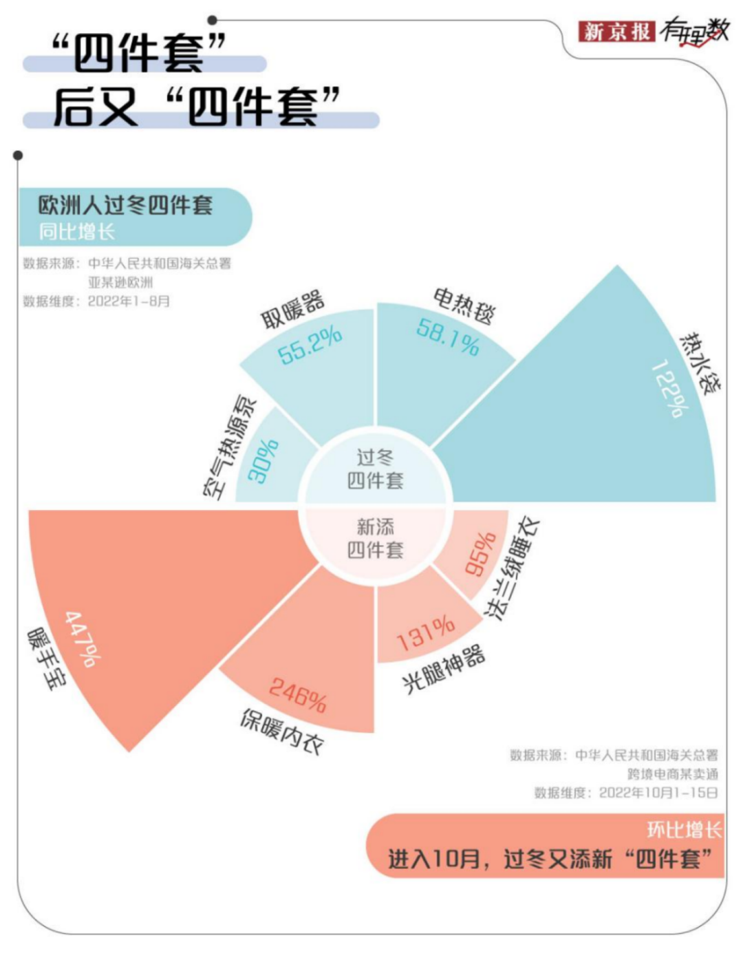 电热毯供不应求,也使得越来越多的中国供暖产品得到了出海的机会。热水袋、取暖器和空气源热泵,联合出圈的电热毯组成了欧洲人的过冬四件套。进入10月,仅15天的时间,暖手宝、保暖内衣、光腿神器和法兰绒睡衣又强势组成了新的“四件套”,其中,暖手宝的销量更是环比增长了447%,翻了四倍还多。越来越多的欧洲人喜欢上了中国的供暖设备和保暖产品。
