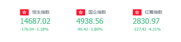 港股早盘探底后震荡反弹,午后再度回落,恒生指数收跌1.18%报14687.02点,恒生科技指数涨1.05%,恒生国企指数跌1.8%。大市成交1309.92亿港元。