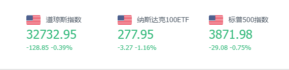 美国三大股指全线收跌,道指跌0.39%报32732.95点,标普500指数跌0.75%报3871.98点,纳指跌1.03%报10988.15点。英特尔跌2.2%,微软跌1.59%,领跌道指。
