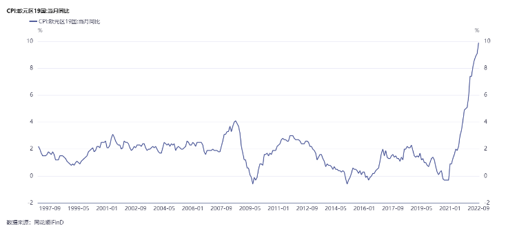 欧盟统计局发布数据显示,欧元区10月CPI初值同比上升10.7%,续创历史新高,高于预期的10.2%及9月终值9.9%。欧元区三季度GDP初值同比增长2.1%,符合预期,较二季度4.1%的增幅“腰斩”。另据消息,欧元区三季度GDP环比仅增0.2%,远低于二季度增速0.8%,强化市场衰退预期。
