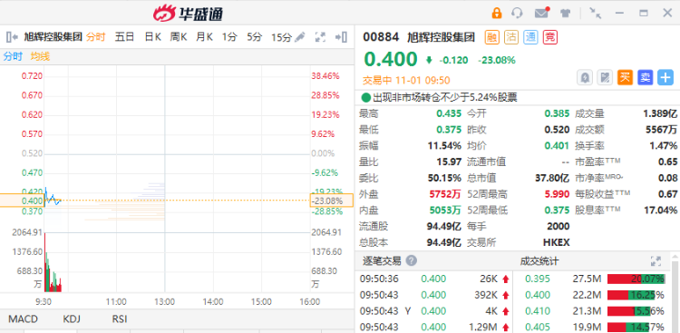 截至发稿,旭辉控股集团跌超23%,报0.4港元。