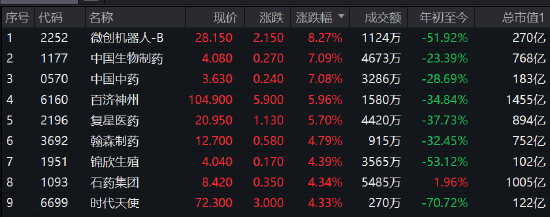 港股医药股集体走高,微创机器人大涨逾8%,中国生物制药涨超7%