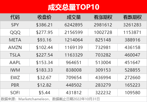 美东时间周一(10月31日),美股收跌,道指跌0.39%,标普500指数跌0.75%,纳指跌1.03%。期权市场方面,交易活跃度环比下滑,期权成交总量为32,243,474张,前值47,442,174张,低于90日平均成交量37,200,503。其中,看跌期权合约占比43%,前值47%,看涨期权合约占比57%。