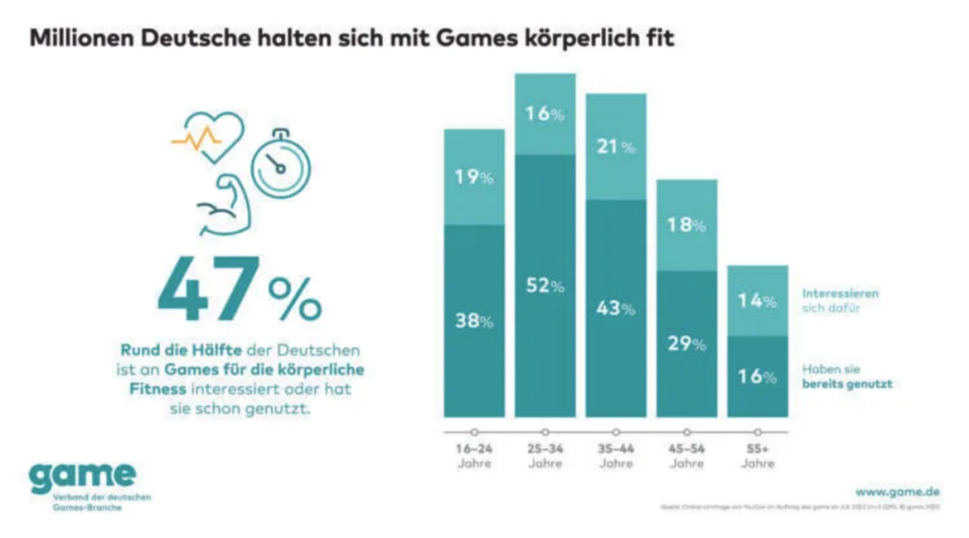 近日,德国游戏产业协会发布了一项针对健身游戏的报告,有大约2000名的16岁以上人群接受了调查,结果显示,大约47%的德国人会对健身游戏感兴趣或已经体验过它们。