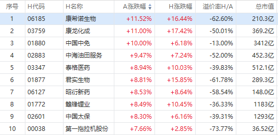 截至A股收盘,AH股涨幅前10如下: