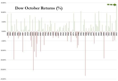 道琼斯10月飙升13.95%,创1976年以来的最佳月度表现,是其自二战以来第三强势的月度回报,同时也是这一蓝筹股指数有史以来最佳的10月回报,标普和纳指分别上涨7.99%和3.95%,结束连续两个月的调整。