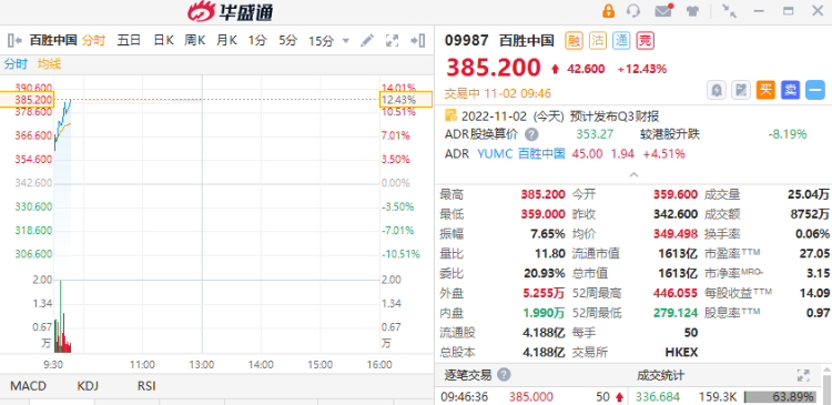 华盛资讯11月2日消息,港股餐饮股走强,截至发稿,百胜中国涨超12%,报385.2港元。公司第三季度总收入为26.8亿美元,同比增长11%;系统销售额较去年同期增加5%,同店销售额恢复至去年同期水平。经营利润为3.16亿美元,较去年同期增加86%。
