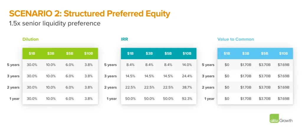 在第二种场景下,该公司以 50 亿美元的估值筹集了 2 亿美元。该新投资者将获得 1.5 倍的高级无参与权的清算优先权。(senior non-participating liquidity preference)假设股份数量不变,新投资者现在将拥有约 3.8% 的公司股份;在并购情况下,新投资者也能保证至少先拿到1.5 倍的收益,然后任何之前的投资者或普通股权持有人才可以分享经济利益。最典型的是在 IPO 情况下,优先股将以 1:1 的比例转换,以至于高于 1.0 倍的清算优先权都不能确保拿到回报,尽管这些投资者可能在 IPO 的情况下已商定好了最低回报。