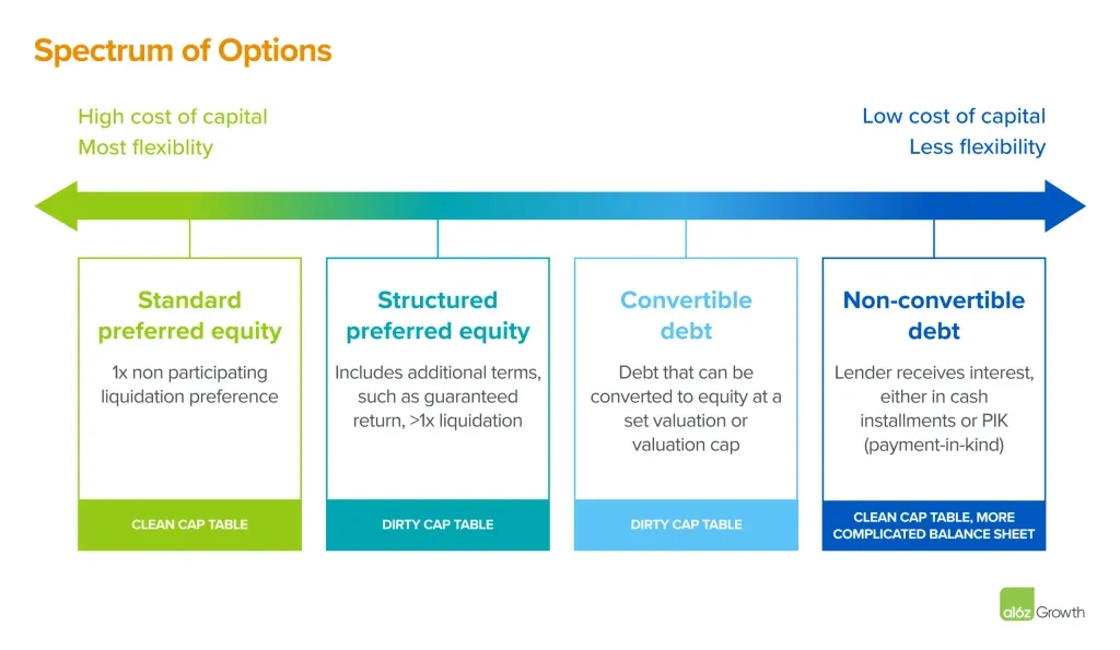 在实践中,可以搭配不同的选项和条款,在后面章节里,我们会深入研究用于增加股权提案的具体条款,并对常见场景进行一一比较。不过,为简单起见,从大的层面来看大抵有四种选项:标准优先股、结构化优先股、可转换债券和不可转换债券。这些选项大致可以看作是资金成本和稀释与灵活性的不同权衡取舍。