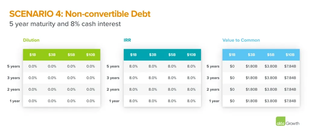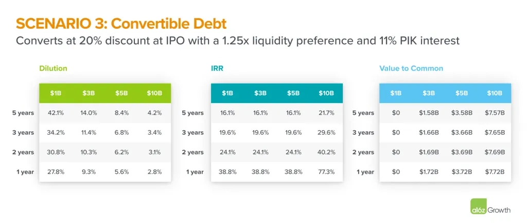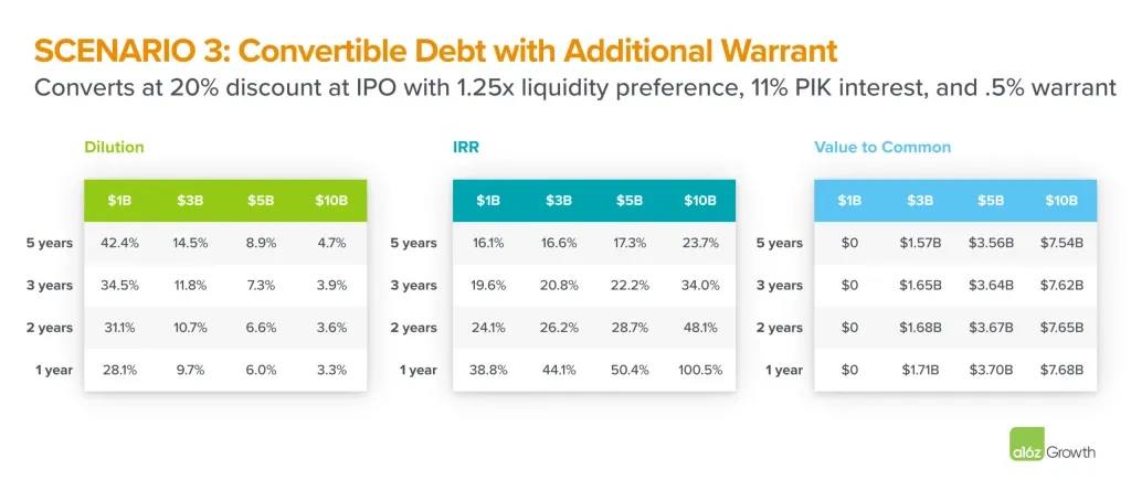对于第三种场景,该公司将以转换价格为 IPO 价格折扣 20% ,11% 的 PIK 利息,以及 1.25 倍的清算优先权,拿到 2 亿美元的可转换债券。新投资者的所有权要取决于 IPO 价格和时机。举个例子,如果公司的估值在两年内比上一轮翻了一番,到IPO 时达到 100 亿美元,那么可转债将转换为2.4%的公司股份。另一方面,如果公司 IPO 价格为 50 亿美元(与上一轮估值持平),则可转债将转换为约 4.8% 的公司股份。如果公司 IPO 价格为 40 亿美元 (比先前估值低 20%),则可转债将转换为约6.0%的公司股份。