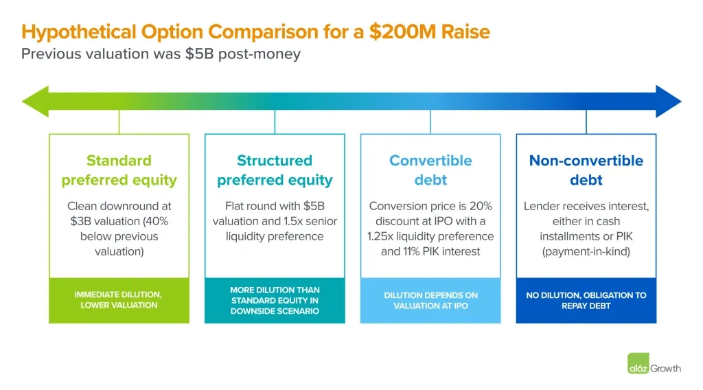 现在我们已经列举了一些最常见的结构化术语,接下来再看看在不同的融资场景下这些东西是如何发挥作用的。为了做好场景设定,假设有一家公司上一轮以 50 亿美元的投后估值进行了融资。但自那次融资之后,市场变得更加艰难,公司被迫在“干净”的贬值轮次、结构化轮次、可转换债务或不可转换债务之间做出抉择。