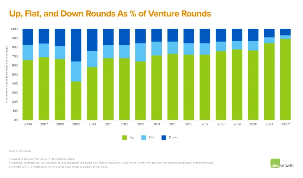 然而,现实情况是,哪怕是在经济景气时期,贬值融资也远比大多数人意识到的要普遍。事实上,像Facebook、Square、DoorDash 和 Box 这样的公司都进行过贬值融资。 2006 年到 2020 年间,平轮和贬值融资在风投融资的占比达 28%。2009 年,全球金融危机结束时,VC融资的中位数都是平轮,而且超过三分之一是贬值融资。