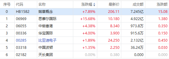 11月2日讯,电子烟概念股早盘普涨,截至发稿,思摩尔国际(06969)涨15.68%;中烟香港(06055)涨4.38%;华宝国际(00336)涨4%;比亚迪电子(00285)涨1.89%。