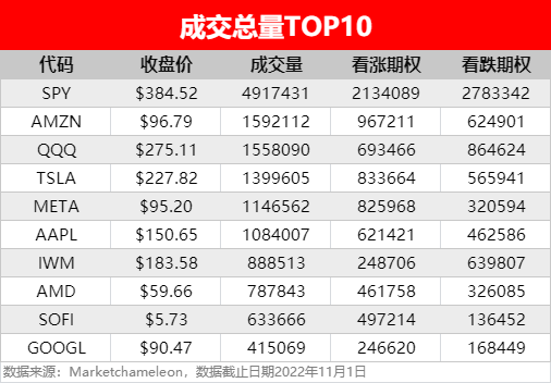美东时间周二(11月1日),美股收跌,道指跌0.24%,标普500指数跌0.41%,纳指跌0.89%。期权市场方面,交易活跃度环比继续下滑,期权成交总量为31,272,357张,前值32,243,474张,仍低于90日平均成交量37,201,582。其中,看跌期权合约占比44%,前值43%,看涨期权合约占比56%。