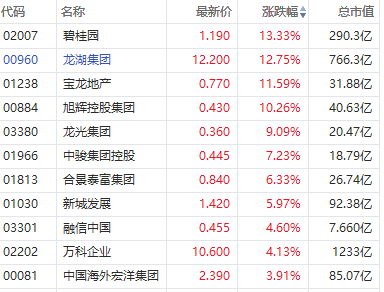 内房股集体爆发,碧桂园涨13%,龙湖集团涨近13%,旭辉控股涨超10%,中骏集团、碧桂园服务涨超7%。